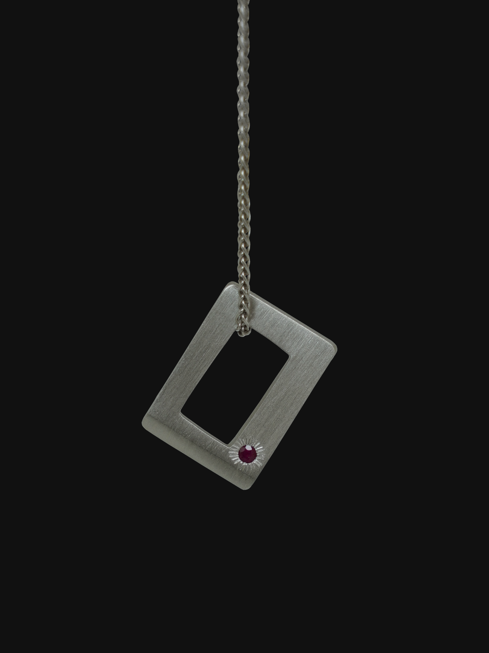 This pendant is handmade from solid sterling silver and finished with a matte texture. The piece is studded with an ethically sourced ruby using our unique sunburst setting. It comes with a complimentary sterling silver chain. The model pictured is wearing a 20 inch chain.